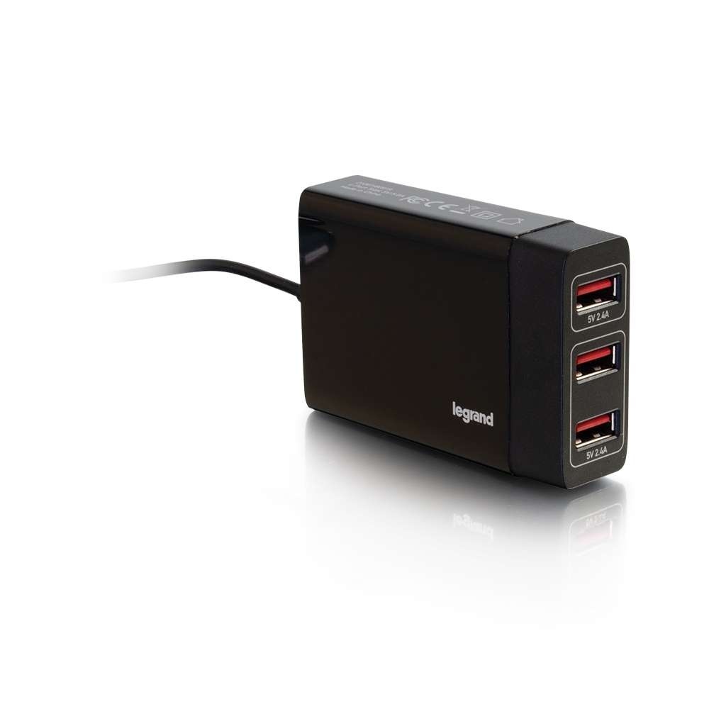 5 volts and 5.8 amps of power are available for device charging from this adapter when it is plugged into a DC outlet. The 5.8 amps are broken down by 2.4 amps for port one and a shared 2.4 amps between ports two and three on the passenger extension, while the DC adapter has a 1 amp port. The power output makes this adapter the perfect solution for charging smartphones and tablets.