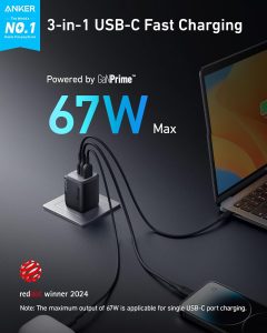 Anker Prime 67W USB C Charger, Anker GaN 3-Port Compact Fast PPS Wall Charger, For MacBook Pro/Air, Pixelbook, iPad Pro, iPhone 15/14/Pro, Galaxy S23/S22, Note20, Pixel, Apple Watch
