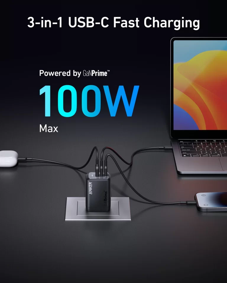 Charge with Unmatched Speed: Experience the efficiency of the Anker 100W Max Three-Port Charging, ensuring devices are powered quickly and ready to go when you are. This Anker USB C charger is ideal for those needing fast power delivery.