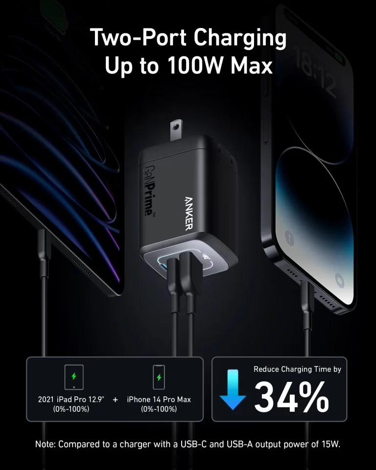 Power Trio on the Move: Simultaneously Fast Charging for 3 Devices with dual USB-C ports and a USB-A port, keeping all your gadgets at full strength on busy days. The Anker prime charger is perfect for multi-device users.