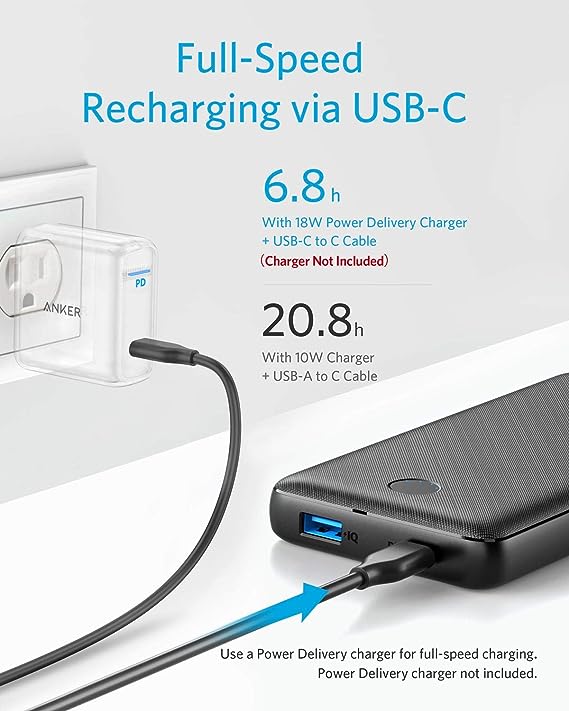 Rapid Recharge: Pair the included USB-C to USB-C cable with an 18W Power Delivery wall charger (not included) to refuel your PowerCore in less than 7 hours. Please note: Recharging with a normal USB wall charger will take approximately 20 hours.