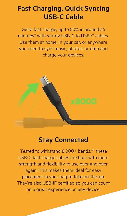 Tested to withstand 8,000+ bends,** these USB-C fast charge cables are built with more strength and flexibility to use over and over again. This makes them ideal for easy placement in your bag to take on-the-go. They’re also USB-IF certified so you can count on a great experience on any device.