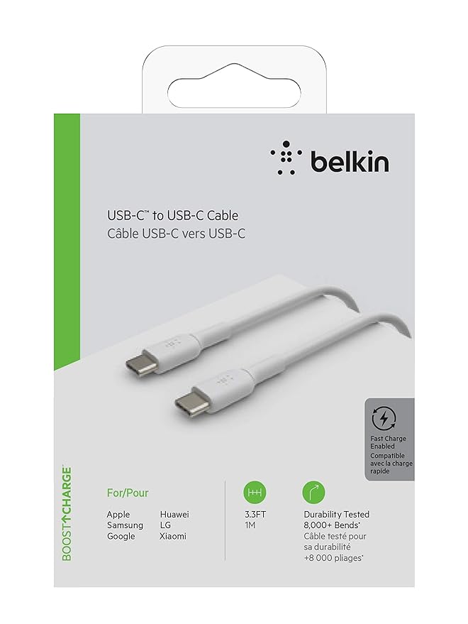 Belkin USB-C to USB-C PVC 3.3 Feet (1 Meter) Fast charging Type C Cable, for iPhone 15 Series and other USB-C Devices, Tough and Durable, 60W PD, USB-IF Certified – White
