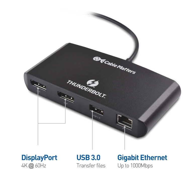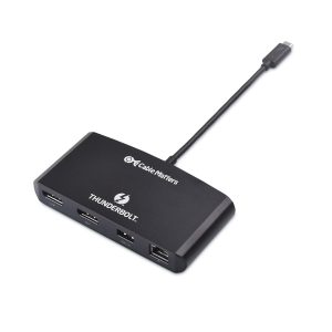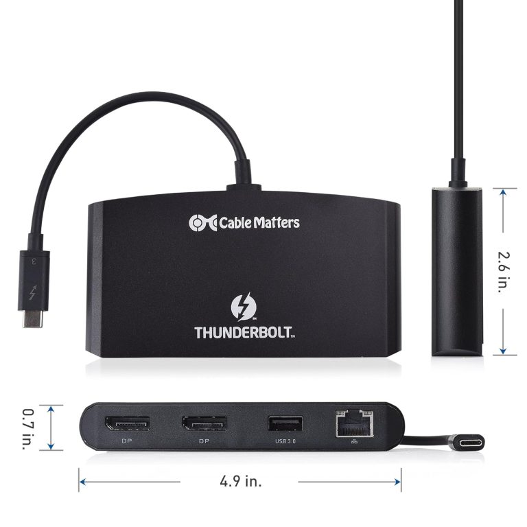 The Cable Matters Thunderbolt 3 to DisplayPort Multiport Adapter provides all the necessary ports to connect a thin laptop with a Thunderbolt 3 port. It provides instant connectivity to dual 4K@60Hz DisplayPort monitors, a Gigabit Ethernet network, and a USB 3.0 or 2.0 device. Windows and Mac compatible with computers with a Thunderbolt 3 port.