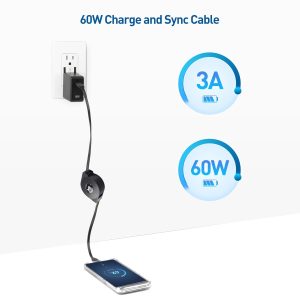 - Retractable Type C charging cable with Power Delivery supports USB-PD charging of compatible phones; Charge up to 60W (20V 3A) with a compatible device; Charge compatible smartphones and tablets quicker than standard USB power with the USB C cable fast charge; USBC 2.0 cable supports a data transfer rate of up to 480Mbps for syncing or transferring files between devices