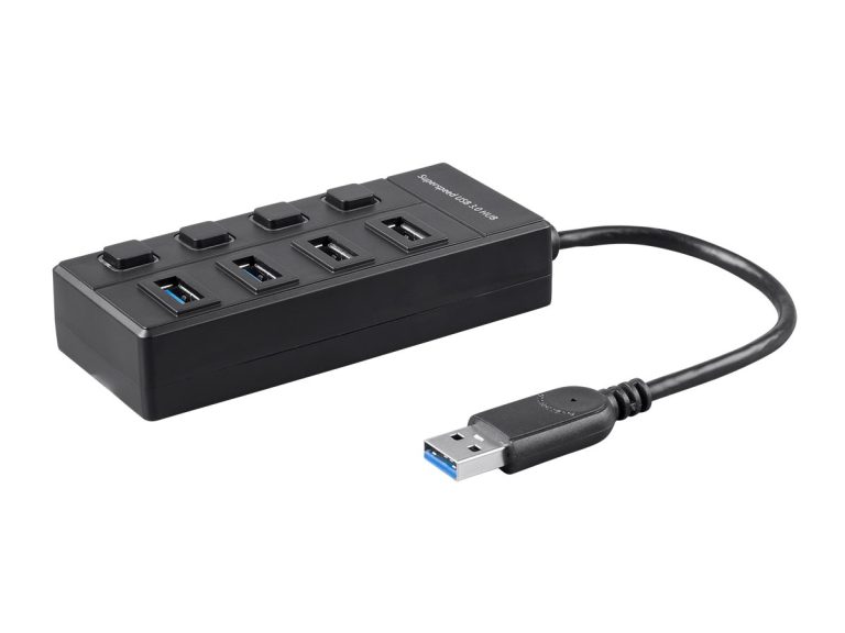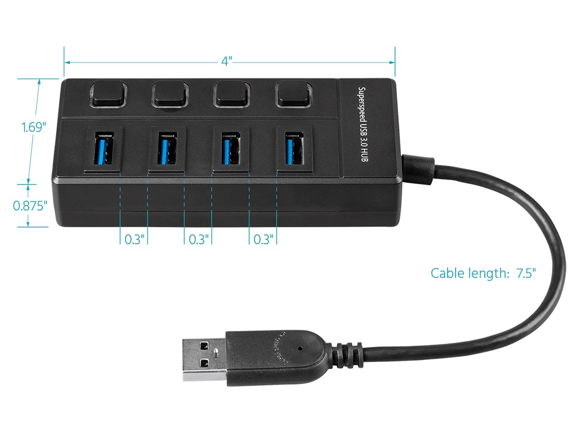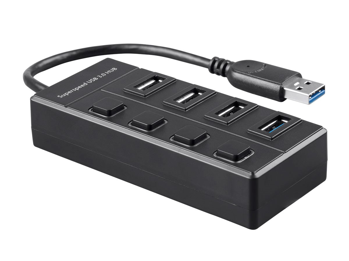 Add extra USB 3.0 ports to your computer by using this 4-port hub. Individual switches make it easy to reset connections or to temporarily disconnect unused devices. The USB port orientation ensures maximum compatibility, even with thicker USB connectors, while maintaining a compact form factor.