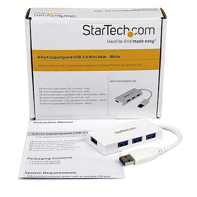 The ST4300MINU3W Portable 4 Port SuperSpeed Mini USB 3.2 Gen 1 Hub (White) lets you expand your USB connectivity by turning a single USB 3.2 Gen 1 port into four external USB 3.2 Gen 1 ports. The integrated cable design makes this mini USB hub the perfect accessory for your Mac® / PC notebook or Ultrabook™ computer.