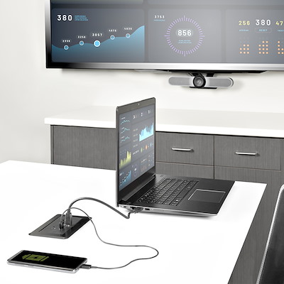 • Turn your conference table into a charging station, a docking station, or an A/V solution for adding displays to your laptop