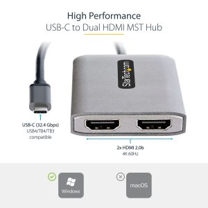 MULTI-MONITOR CONFIGURATION: USB Type-C to Dual HDMI MST Hub/Splitter drives up to two 4K 60Hz displays from a USB-C DP 1.4 host with DSC; USB Powered; Supports HDR and 2ch HDMI Audio; HDCP 2.2; TB3/TB4/USB4 Compatible; Not compatible with macOS