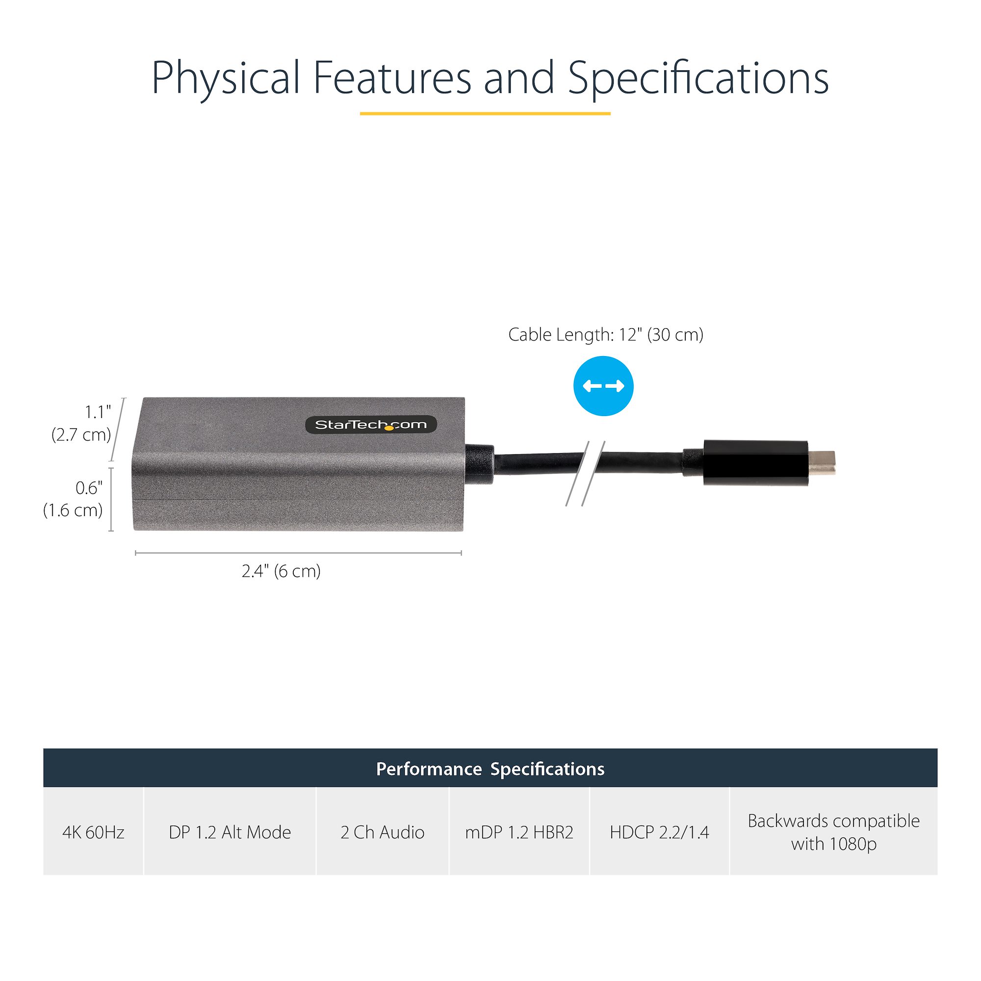 • HIGH PERFORMANCE: An Upgrade to CDP2MDP, this USB C to Mini DisplayPort adapter connects to an mDP display or monitor supporting resolutions up to 4K 60Hz UHD (3840×2160) | mDP Alt Mode | DP 1.2 HBR2 | 2ch Audio | HDCP 2.2/1.4 | works w/ 1080p