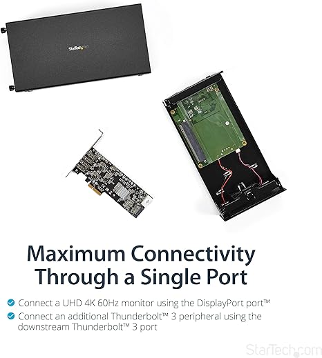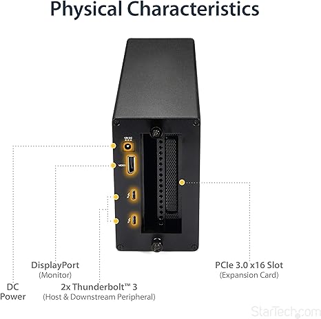 This Thunderboltâ„¢3 PCIe expansion chassis lets you add a PCI Express card to your laptop or desktop computer, through an external Thunderbolt 3 connection. The chassis also features a DisplayPort video output, so you can connect an additional monitor to your laptop, and supports Thunderbolt 3 daisy chaining, so you can expand your workstation even further.