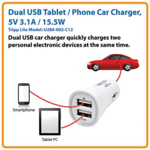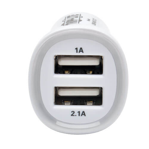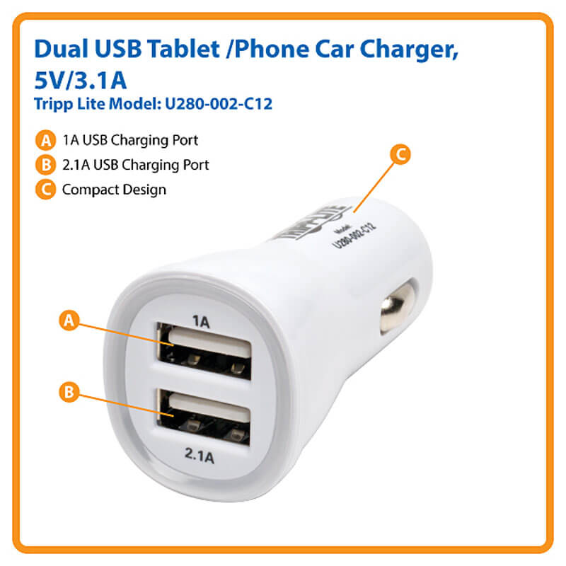 The 3.1A Dual USB Car Charger allows you to quickly and safely charge two USB-powered devices simultaneously. Its dual-port interface features one 5V 2.1A USB charging port, ideal for ultra-fast charging of devices, and one 5V 1A USB charging port for iPhone, iPod and other USB-powered devices. This high-quality and ultra-compact charger works with any standard in-vehicle power outlet and features a translucent ring around the USB ports that glows blue to indicate power being passed through. It is a handy tool to keep your devices fully charged and ready to use while you are on the go.