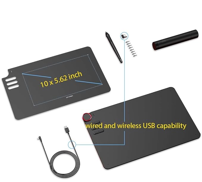 - It includes Pen Tablet, P05 Passive Pen, USB-C cable, Quick Guide, 8 Pen Nibs New Pen Holder, Wireless receiver and Anti-fouling drawing glove